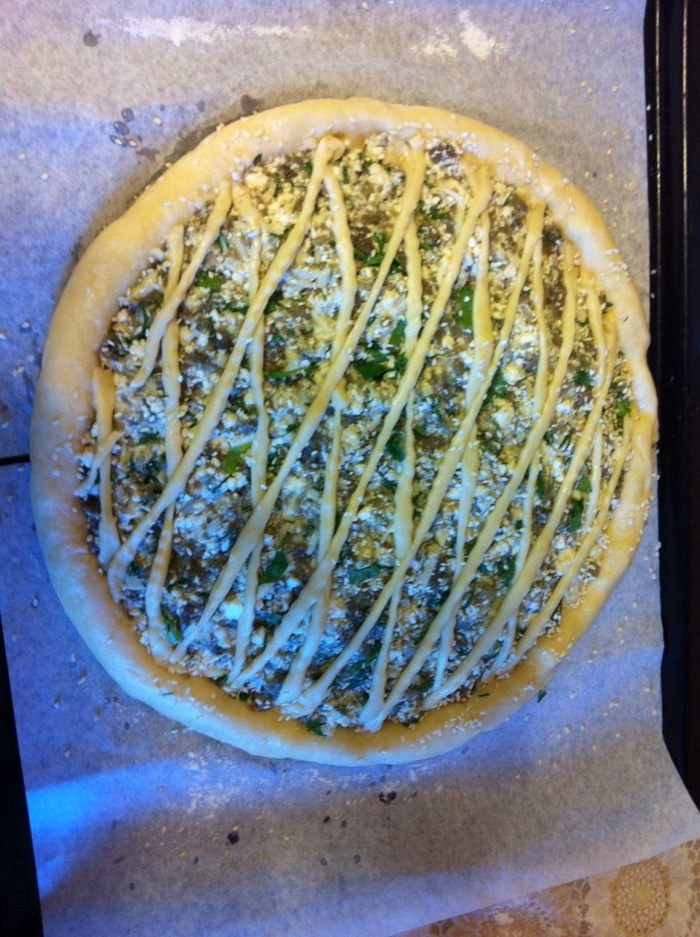 Сделать решетку, я помазала водой и присыпала кунжутом. Выпекать на пергаменте при 180С 40 минут. Подавать можно как теплым так и холодным.