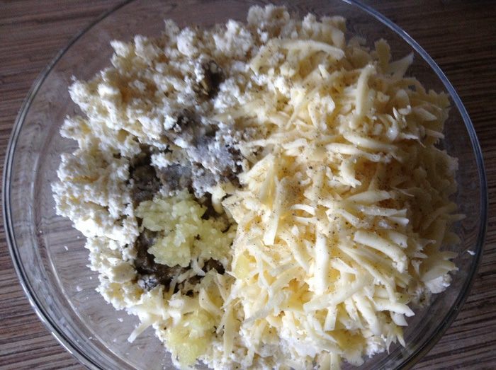 Сто грамм твердого сыра натереть на крупной терке, адыгейский сыр размять добавить к баклажанам, посолить, поперчить, добавить пропущенный через пресс чеснок.