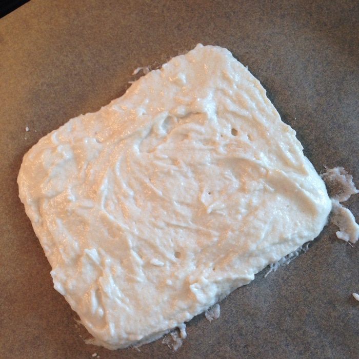 переложить тесто на пергамент,формируя квадрат или прямоугольник толщиной 1 см, и выпекать 8-10 минут при 210 гр.