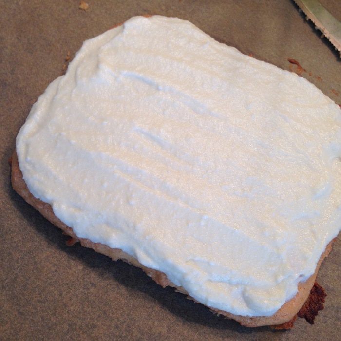 Полностью остывший корж смазать кремом из рикотты.