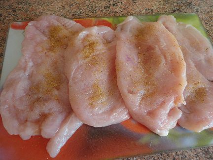Куриные грудки разрезать вдоль пополам, завернуть в пищевую пленку и отбить. Затем натереть солью и специями.