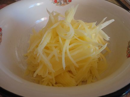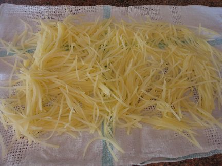 Картофель (общий вес 300-330 гр) натереть соломкой. Это легко сделать на терке для корейской моркови.