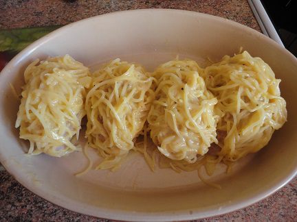 а затем в картофельно-яичной смеси. Выложите в смазанную маслом форму для запекания.