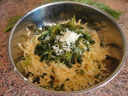 Любой твердый сыр натереть (лучше на мелкой терке), холодное сливочное масло можно натереть на крупной терке. Чеснок измельчить, можно тоже натереть на терке. Добавить рубленую зелень.
