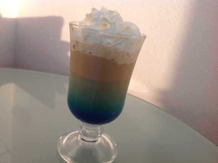 В ингредиентах нет ликера "Блю Кюрасао", поэтому добавила просто ликер, я использовала взбитые сливки из баллончика.