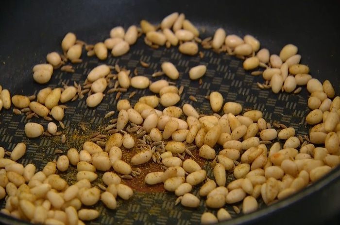 Кедровые орехи, зиру и карри подсушить на разогретой сковороде.