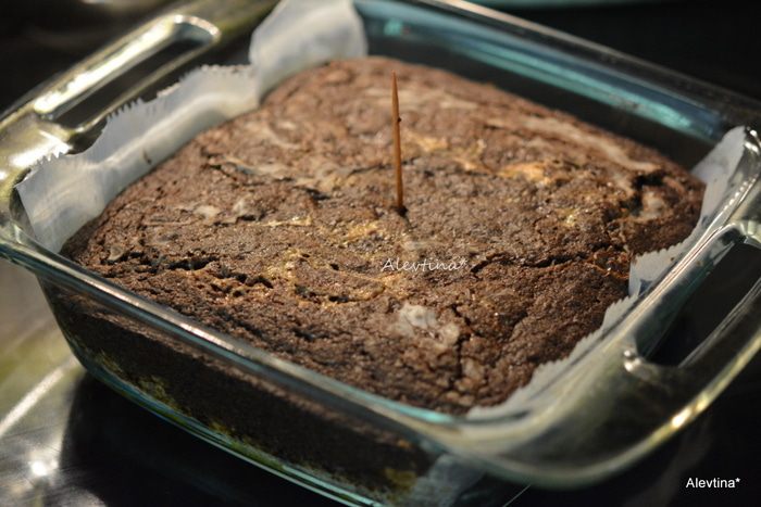 Выложим шоколадный слой поверх основного. Поставим в духовку на 25-30 мин. Готовый брауни проверяем зубочисткой. Сухая, брауни готов. Дадим остыть.
