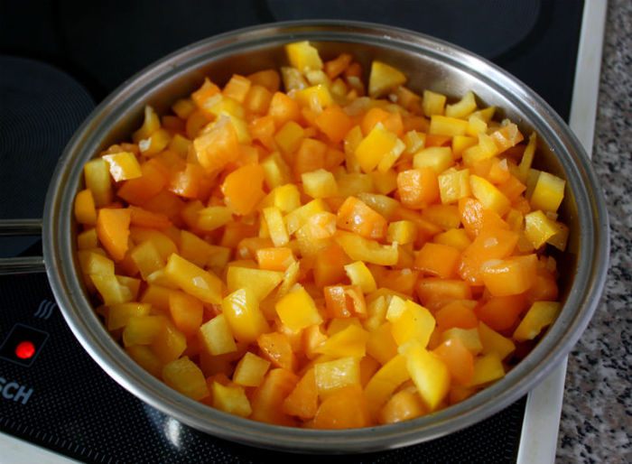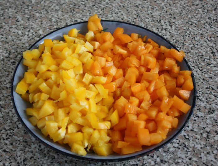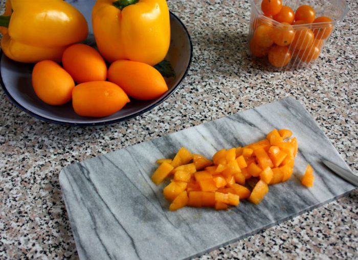 Вымойте, очистите от семян томаты и перцы, нарежьте их кубиками. С томатов желательно, но не обязательно, снять кожуру, опустив их предварительно сначала в кипяток, затем в холодную воду по 1 минуте.