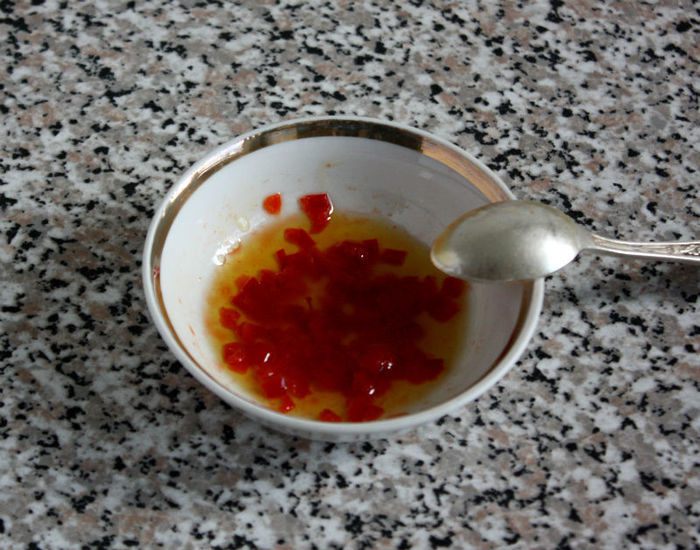 Чили положить в ступку, хорошо растереть и смешать с 2 ст.л. масла. Отставьте в сторону.