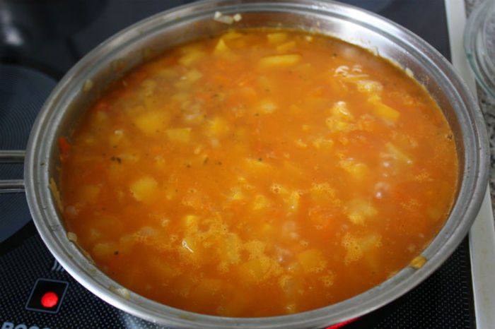 Влейте горячий бульон, накройте крышкой и варите около 20 минут.