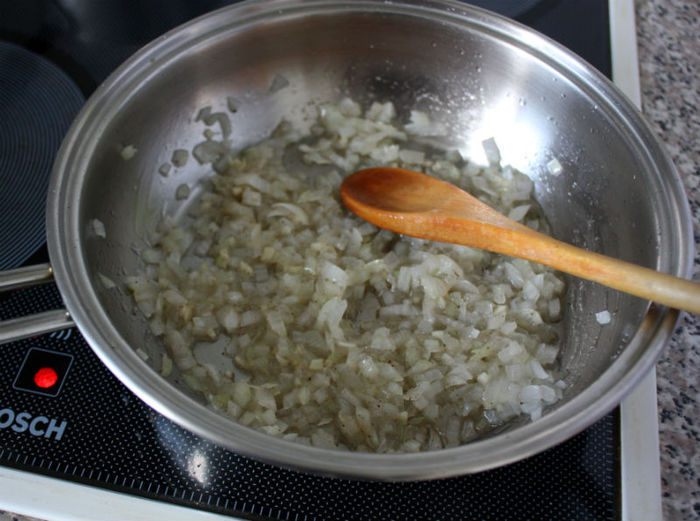 Нагрейте 3 ст. л. масла в большом сотейнике. Обжарьте слегка сначала лук, чеснок.