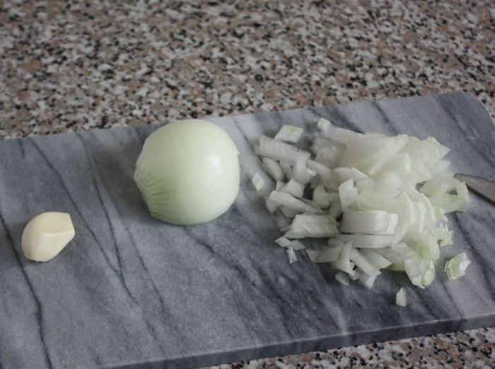 Очистить лук, чеснок и острый чили, мелко нарезать.