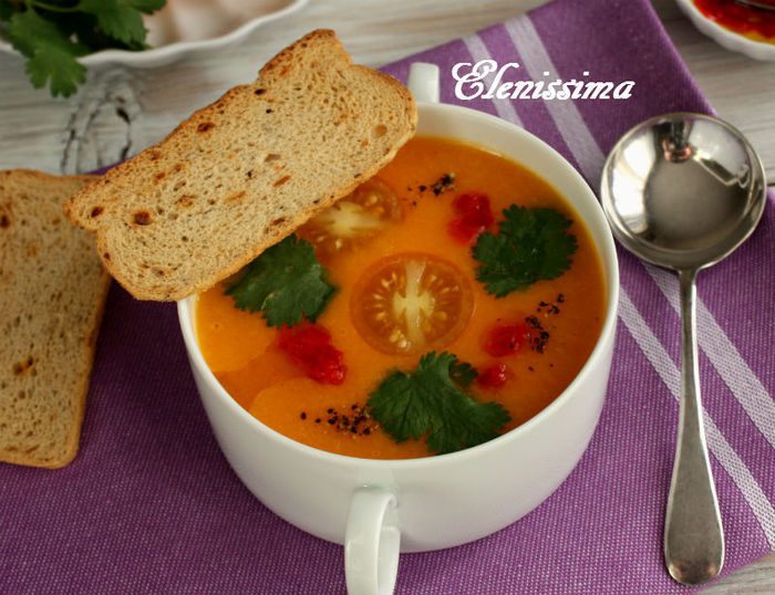 Очень он мне понравился и цветом, и вкусом, и простотой приготовления. Если у вас найдётся готовое масло с чили, то ещё проще и быстрее получится. К этому супу хорошо подходят креветки. Можно обжарить по 3 на шпажке (на сковороде с маслом). Положить сверху на чашку с супом. С тостами мельба тоже замечательно - у меня куплены готовые.