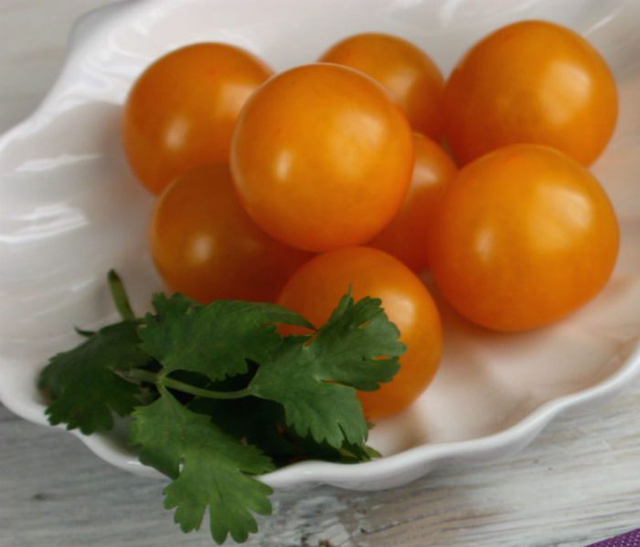 Вымойте и разрежьте пополам помидоры черри. Разложите их в 4 суповые тарелки, а лучше в чашки.