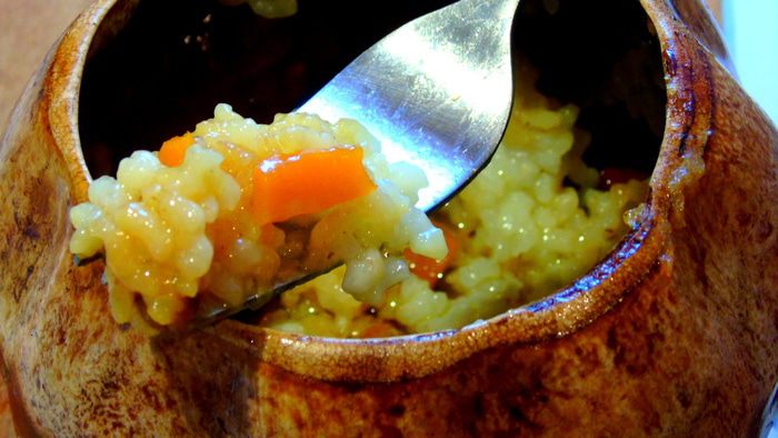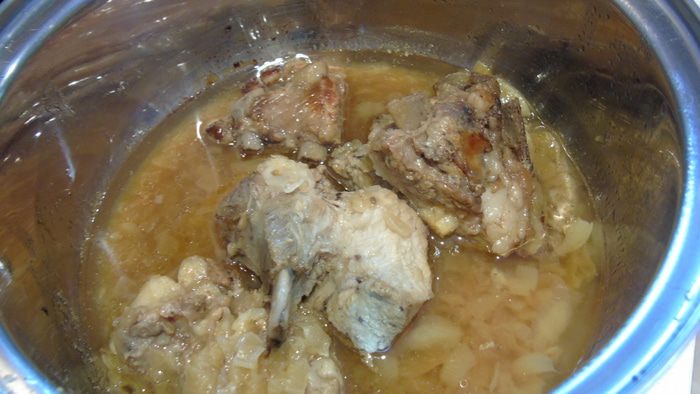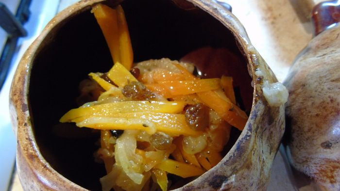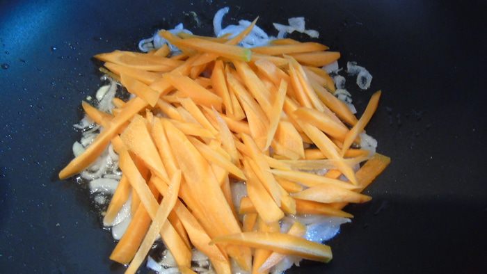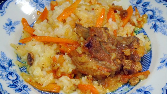 Лук нарезать и обжарить на масле виноградных косточек (если нет, то на обычном растительном), следить, чтобы лук ароматизировал масло, но не пригорел. Добавить нарезанную морковь. Влить пару ложек бульона, где варилось мясо, и дать моркови потушится пару минут. Добавить зиру, барбарис и изюм. Рис отварить.