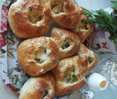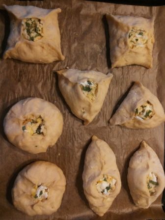Тесто делим на 8 кусочков. Можно больше, все зависит от того, какого размера пирожки вы в итоге хотите получить (мои пирожки довольно большие). Можно сделать и одним пирогом. Каждый кусочек раскатываем в лепешечку, кладем начинку (начинки должно быть много!) и формуем пирожки кому как больше нравится: кругленькие, треугольные, квадратные или "лодочками"! Кладем на противень, застеленный пекарской бумагой, и оставляем на 20 минут. Смазываем взбитым яйцом и выпекаем в духовке при температуре 200 градусов до румяной корочки, примерно 15 минут.