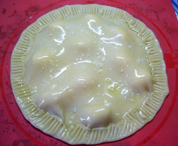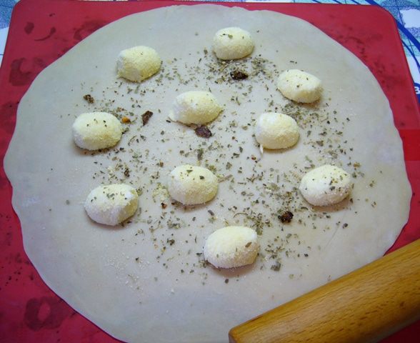 Теперь раскатать меньшую часть теста, накрыть ей сыр, хорошенько защипать края. Можно пройтись по окружности вилкой. Смазать поверхность фокаччи 1 ст. л. оливкового масла, присыпать крупной морской солью. Отправить фокаччу в духовку, разогретую до 220 градусов на 15 минут.