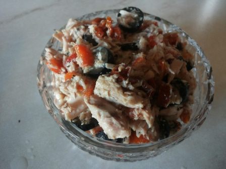 С салатом из тунца тоже все предельно просто. Запекаем перец, снимаем кожицу, измельчаем и соединяем с тунцом (жидкость слить, тунец слегка размять), тонко порезанными вялеными томатами, крупно нарезанными оливками, маслом, паприкой, солью и оливковым маслом.