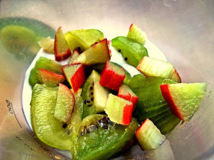 Кинуть туда же киви, ревень. Киви можно не сильно мельчить.