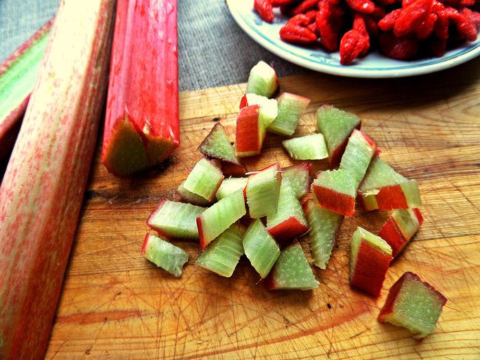 Ревень (кусочек 5-6 см) нарезать на кубики.