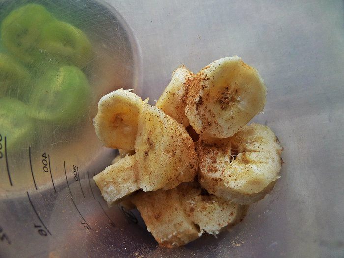 Банан нарезать на кружочки, посыпать корицей, ванилью.