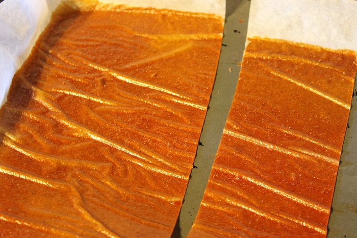 Застелить противень пергаментом и вылить полученное пюре, разровнять ножом. И отправить в заранее разогретую до 90 градусов духовку, на 3-4 часа. Дверь духовки должна быть приоткрыта, можно вставить деревянную шпажку.