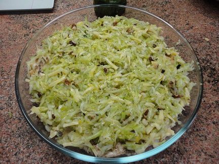 Включить духовку для разогрева до 180-200 градусов. Цукини слегка отжать и смешать с цедрой, сыром, орехами и листиками тимьяна. Приправить черным перцем и перемешать. Переложить мясо в жаропрочную форму, на него выложить смесь из цукини. Сбрызнуть оставшимся оливковым маслом и запекать в духовке 20-30 минут.