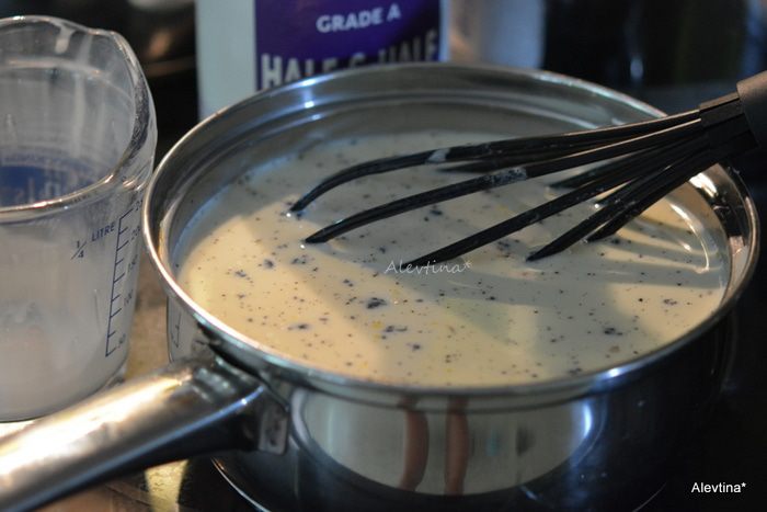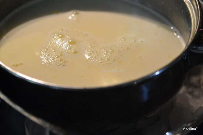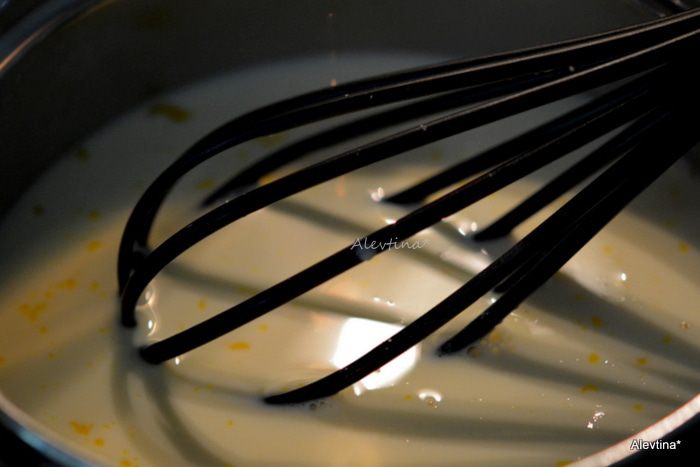 Используем в рецепте молоко whole milk и сливки 10-12% half and half. Взбить яичные желтки с молоком в кастрюльке. Добавить сахар и поставить на средний огонь, помешивать примерно 10 минут. Когда окунете ложку она должна быть окутана мягкой текстурой молочной. Снять с огня.