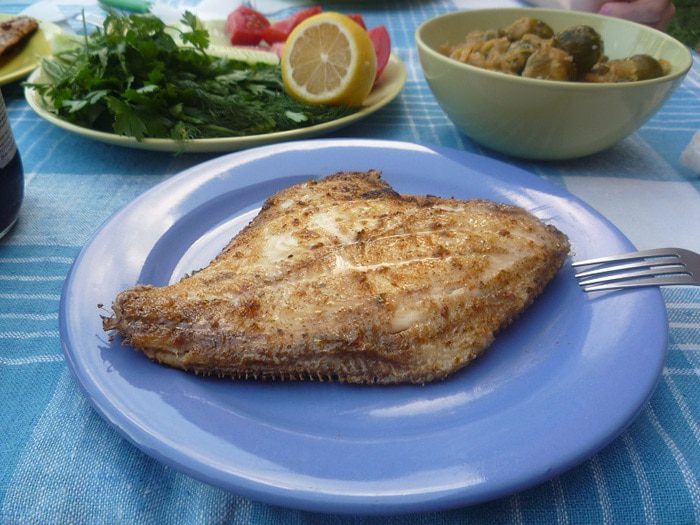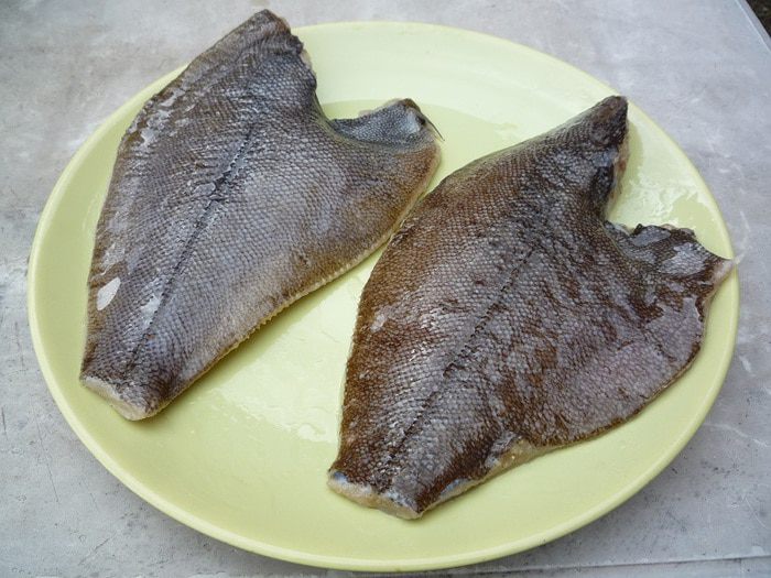 Камбалу средних размеров очистить от чешуи и внутренностей, убрать голову, затем хорошо промыть.