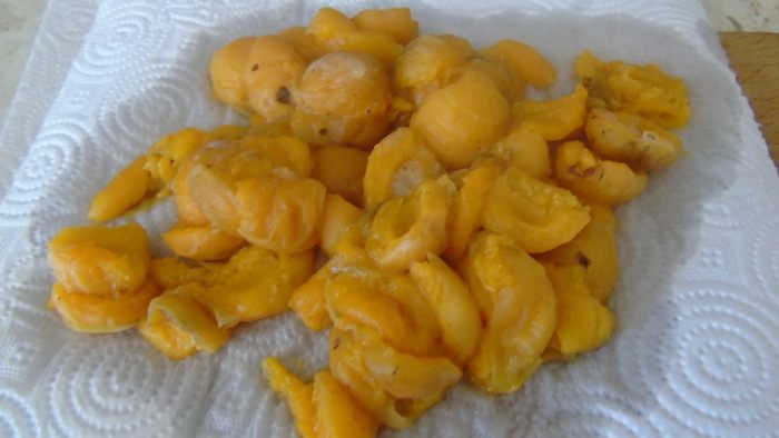 Пока наше тесто прохлаждается, мы приготовим начинку. Абрикосы очистить от косточек, положить в кастрюльку, добавить сахар, 1 пакетик чая с манго, залить водой, так чтоб вода покрывала фрукты. Тушить на маленьком огне, пока абрикосы не будут легко протыкаться вилкой. Выложить на бумажное полотенце. Дать остыть.