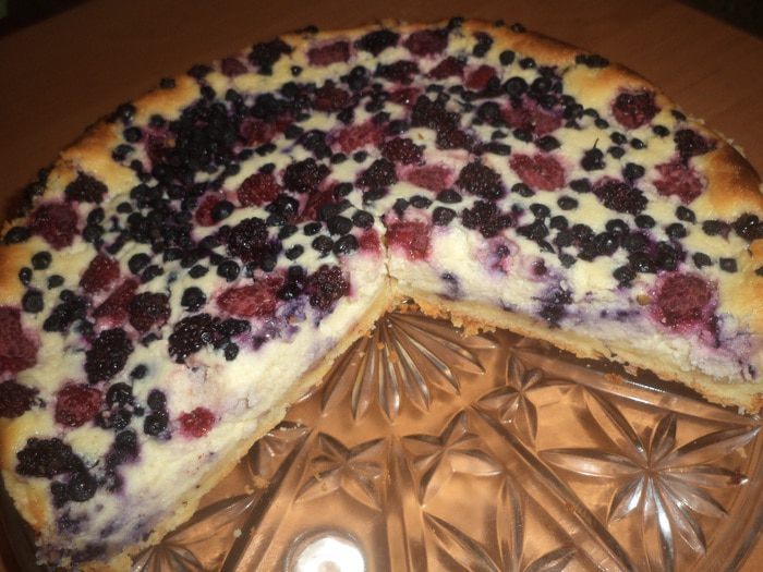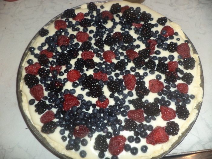 Форму для выпечки смазать маслом, присыпать мукой, выстелить форму тестом, сформировав высокие бортики. Вылить на тесто начинку. А на начинку выложить ягоды. Я использовала малину, ежевику и чернику. Но, конечно, можно попробовать и другие сочетания ягод.