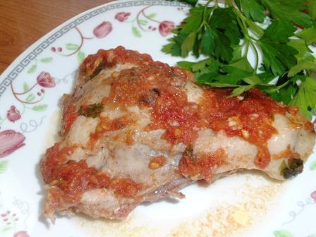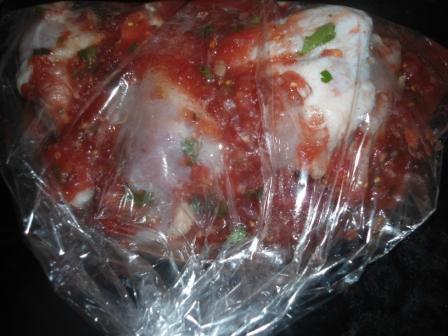 Петрушку порубить мелко, добавить к курице. Куски курицы и маринад переложить в пакет для запекания, завязать. Запекать в разогретой до 220 градусов духовке 20 минут. Получилось сочное мясо и много соуса-подливы)))