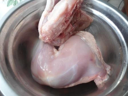 Курицу вымыть и убрать кожу, по желанию разделить на куски. Я на 2 кусочка разрезала.