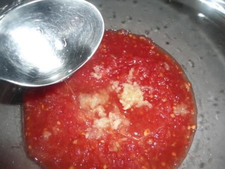 Чеснок измельчить прессом, добавить к помидорам, вместе с маслом, солью и перцем.