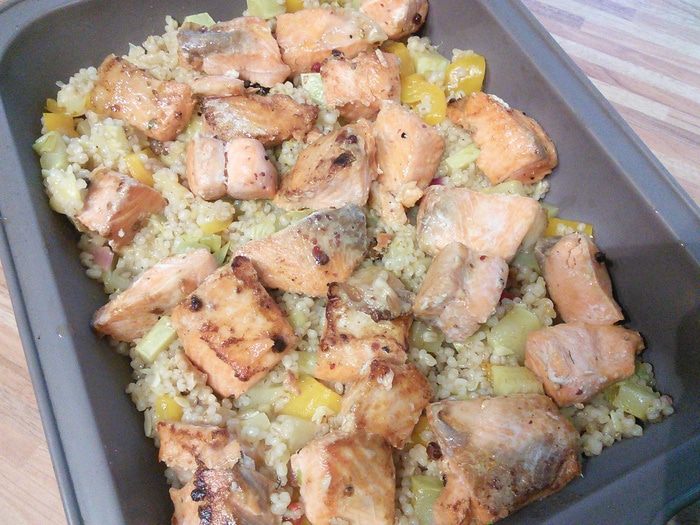 Всыпать перловку, перемешать, влить свежевыжатый сок двух апельсинов и лимона, накрыть крышкой и тушить до полуготовности перловки. У меня перловка голландка, поэтому время готовки у неё меньше, чем у обычной. Обычную перловую крупу следует заранее отварить до полуготовности. Посолить и поперчить. Иногда посматривайте, возможно необходимо добавить чуть водички.