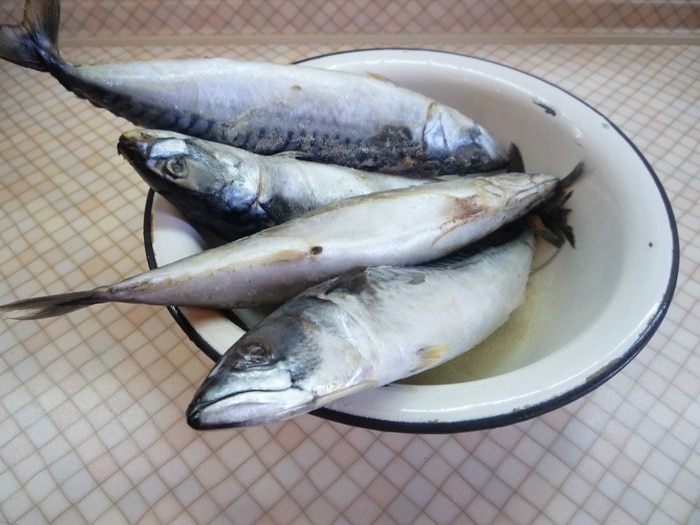 Скумбрию предварительно размораживаем в естественных условиях, чистим, удаляем внутренности.