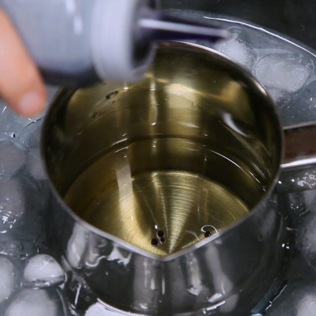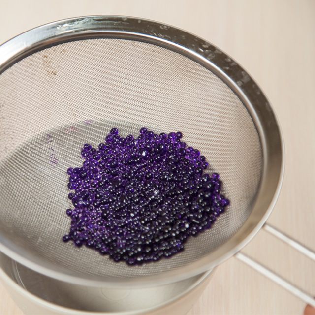 Достать масло из морозилки.Ледяное масло очень густое, похоже на вазелин. Поставить масло на ледяную "баню" (т.е. в емкость со льдом и ледяной водой) и отсаживать икринки по-одному. Очень важно, чтобы масло оставалось ледяным. Если начнёт подтаивать, уберите снова ненадолго в морозилку.