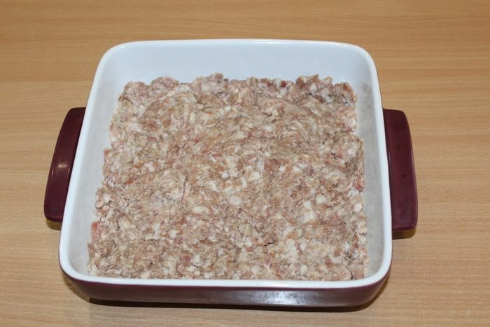 Выложите готовый фарш в форму для запекания.