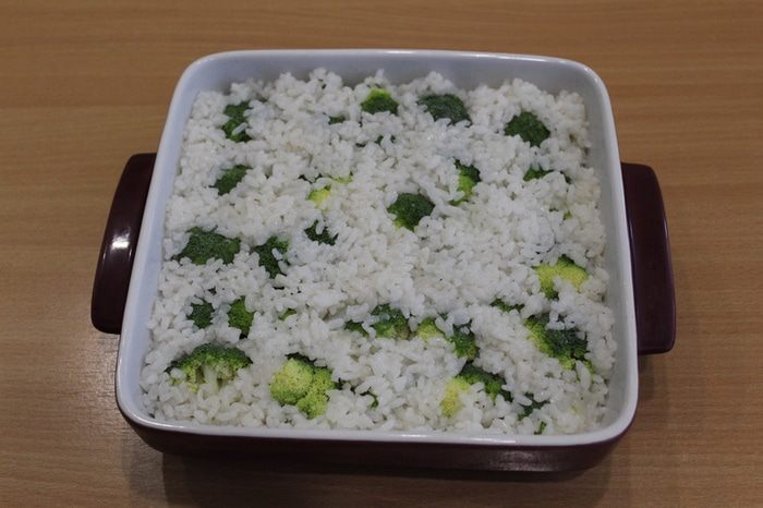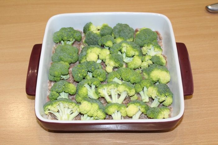 Теперь сверху выложите свежую брокколи, разобранную на соцветия.