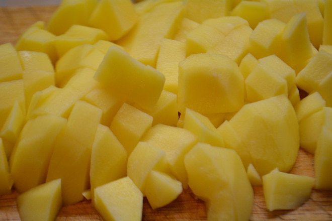 Картофель почистить и порезать крупными кубиками.