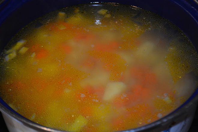 Переложить овощи в кастрюлю и залить водой или бульоном. Варить до готовности картофеля. Воды добавляем по вкусу, смотря какой густоты вы любите суп.