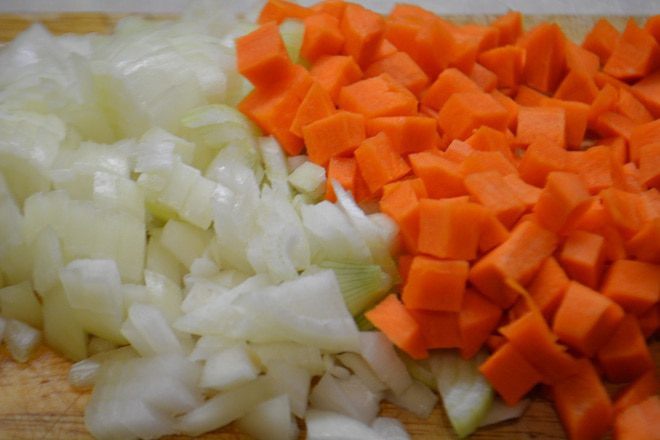 Лук и морковь почистить и порезать кубиками.