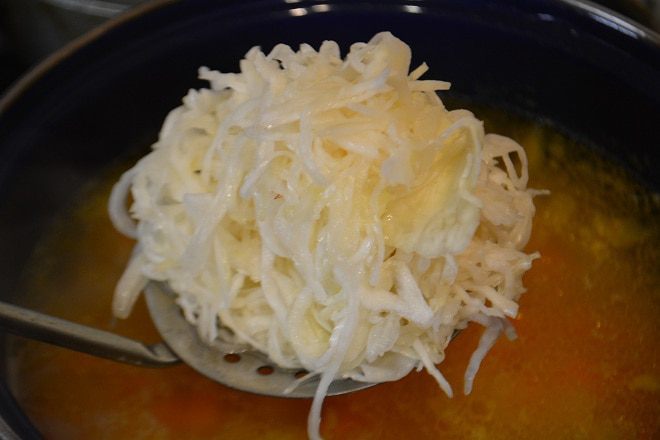 Как только картофель начнет развариваться, добавляем квашенную капусту. Варим 5 минут, пробуем на соль, при необходимости добавляем. Выключаем суп.
