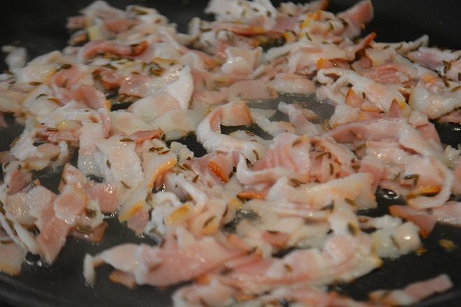 Бекон режем соломкой и обжариваем с тмином (ложка с горой) до подрумянивания.