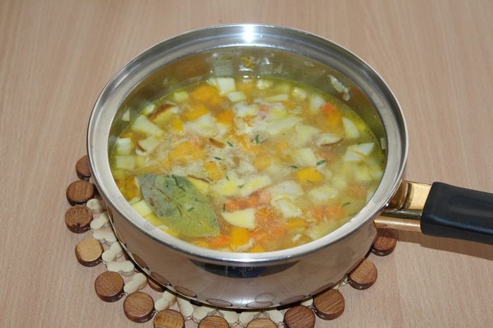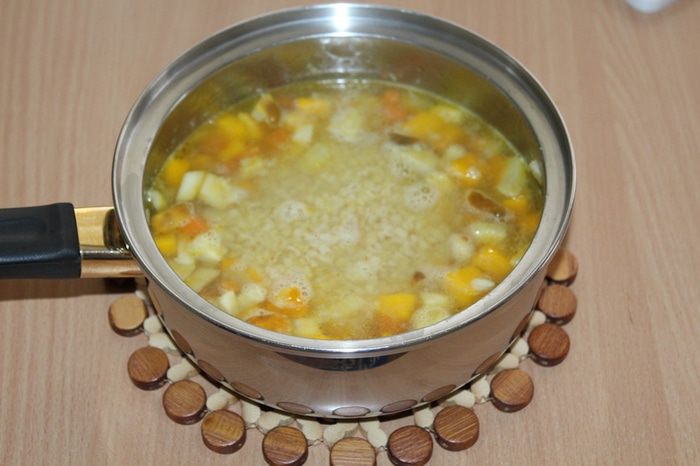 Влить горячий бульон, добавить отваренный заранее булгур.