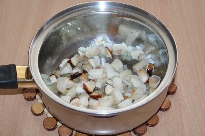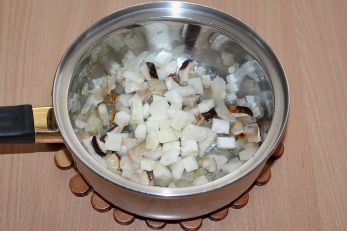 Добавить нарезанные кубиками грибы.