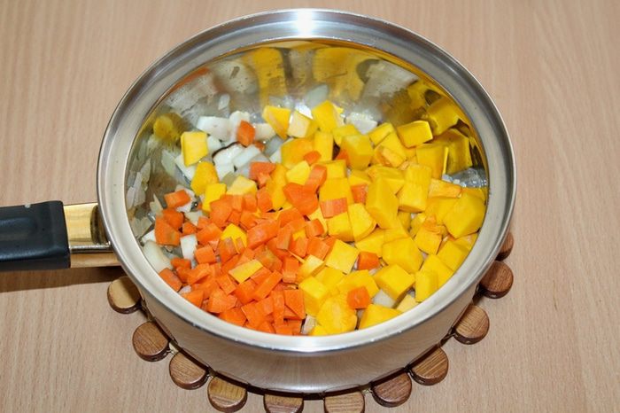 Разогреть в толстостенной кастрюле растительное масло и обжарить в нем до прозрачности мелко нарезанный лук.