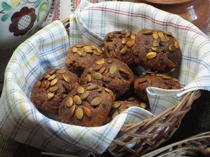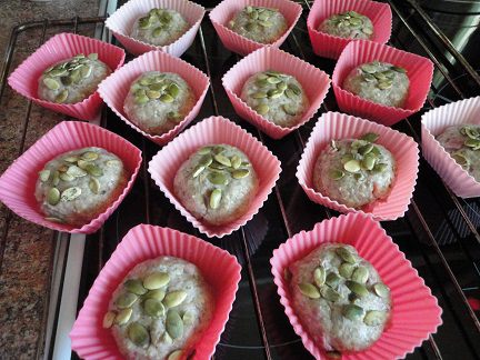 Разделать на кусочки по 40 — 50 граммов, скатать в шарики и уложить в формочки. У меня получилось 14 штук. Смазать желтком и посыпать оставшимися семечками. Дать расстояться еще полчаса.