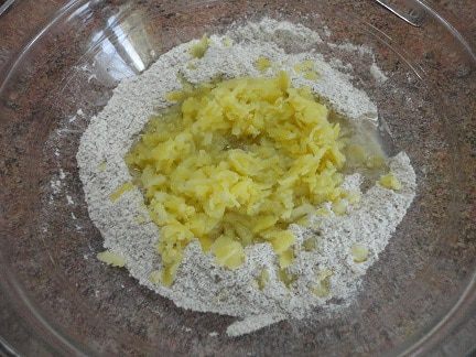 Вареный картофель натереть на терке и добавить к сухим ингредиентам вместе с теплой водой. Замесить тесто и поставить в теплое место (лучше в нагретую до 35°С духовку) примерно на час. Тесто тяжеловатое, поэтому требуется время для подъема.
