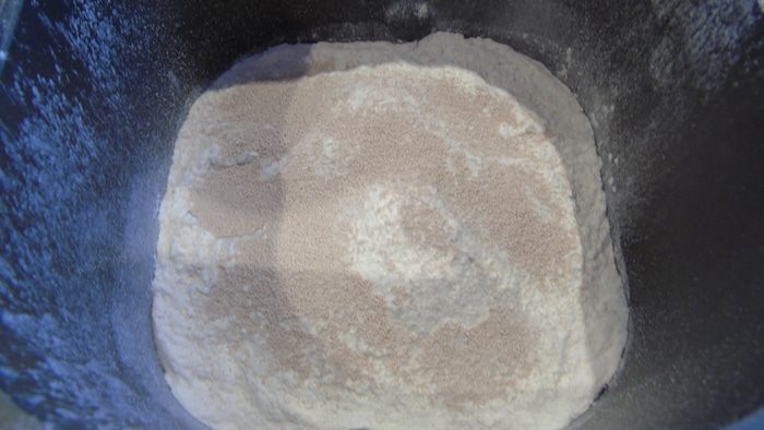 Всыпаем муку, сахар, соль, сухое молоко и дрожжи. Включаем режим замеса теста. Если же замес вручную, то месите до гладкости, чтоб тесто легко отходило от рук. Даем тесту 1 ча, чтобы подойти.